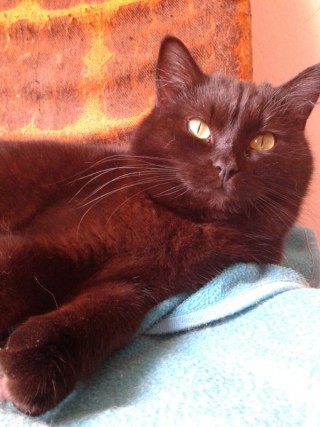 Tento černý kocourek je dnes spokojený v bytě, dříve však žil venku a při rvačkách s kocoury přišel o levé oko a horní špičáky. Dnes je to ale velký mazlík, nikdy se nepere, má rád pozornost, pořád se otírá o nohy, nastavuje se pod rukou. Vhodný je do klidnější domácnosti, spíše ke starším lidem. Uvítal by i nedominantního kočičího spolubydlícího, je zvyklý na kočky okolo sebe, je společenský a nekonfliktní. Rád papá a čistotnost je u něho samozřejmostí. Umí škrábat na škrabadle. Dne 19.9.2009 mu bylo odstraněno nefunkční oko, které dělalo problémy.